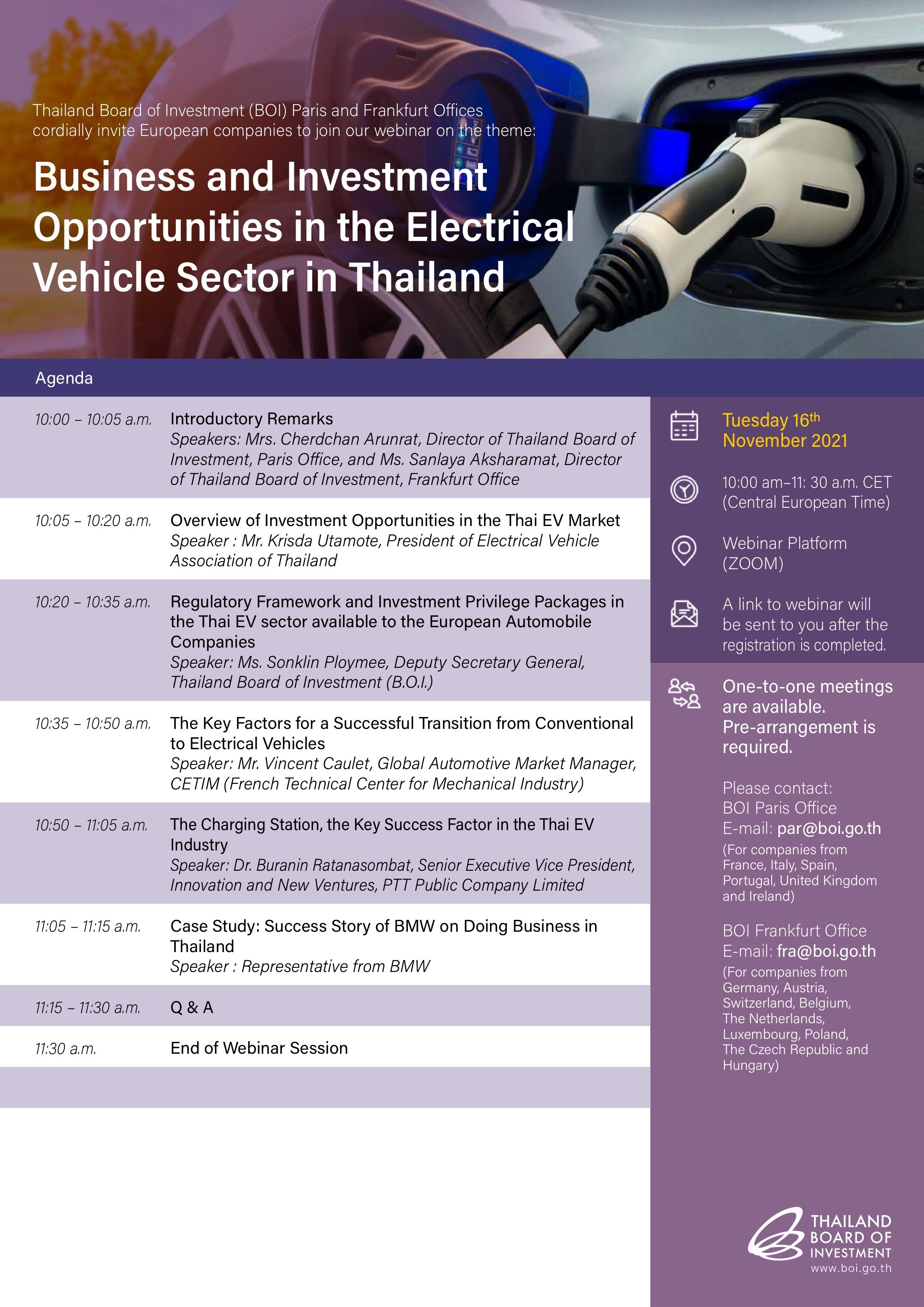 BOIPARIS vous propose de participer à son webinar "Opportunités d'affaires et d'investissements dans le secteur des véhicules électriques en Thaïlande " mardi 16 novembre 2021